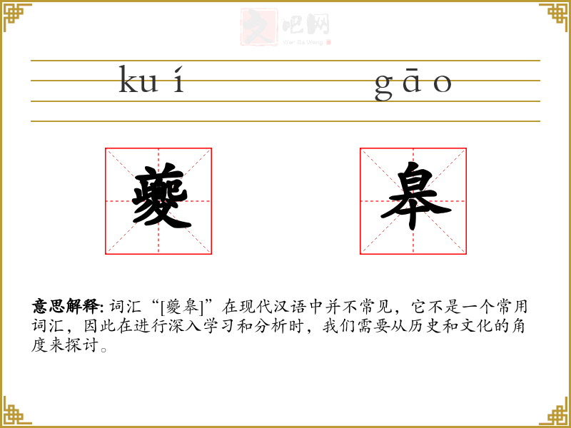 词汇“[夔皋]”在现代汉语中并不常见,它不是一个常用词汇,因此在进行深入学*和分析时,我们需要从历史和文化的角度来探讨。
