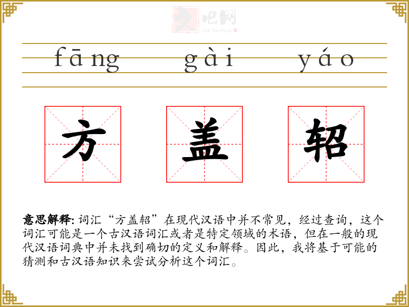 词汇“方盖轺”在现代汉语中并不常见,经过查询,这个词汇可能是一个古汉语词汇或者是特定领域的术语,但在一般的现代汉语词典中并未找到确切的定义和解释。因此,我将基于可能的猜测和古汉语知识来尝试分析这个词汇。